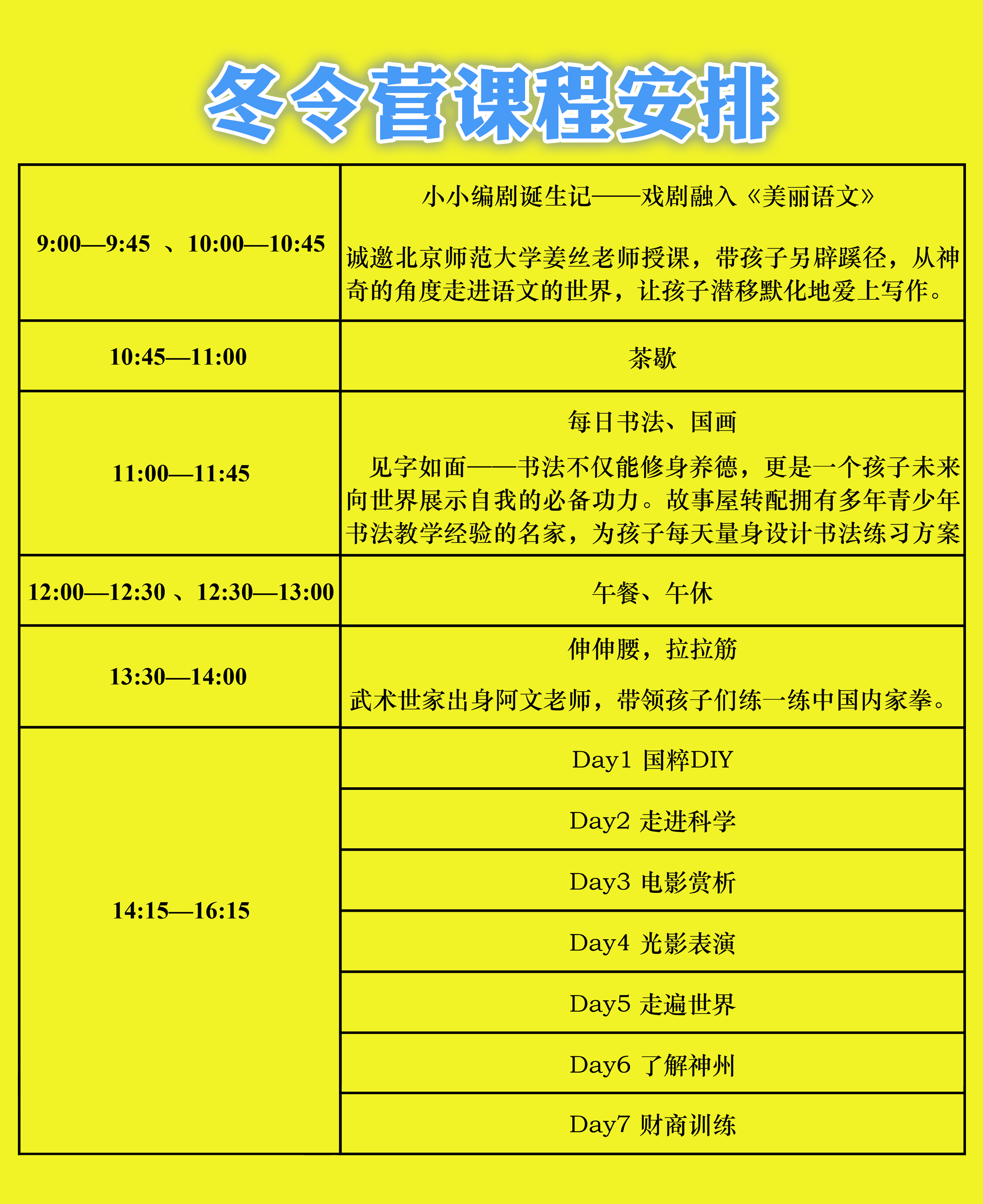 ◆冬令营期间,孩子们要共同排演剧目、完成商业训练等内容,全程实践团队协作与责任分享的素养教学,因此不要请假,避免团队受影响,自己留遗憾。